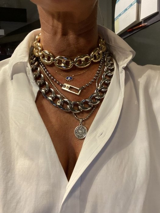 Крупные цепи не сдают позиции и остаются среди фаворитов сезона. Их носят не только на шее — они украшают сумки, ремни и даже обувь.