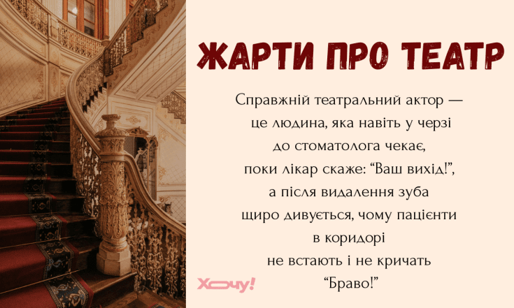 Справжній театральний актор — це людина, яка навіть у черзі до стоматолога чекає, поки лікар скаже: “Ваш вихід!”, а після видалення зуба щиро дивується, чому пацієнти в коридорі не встають і не кричать “Браво!”