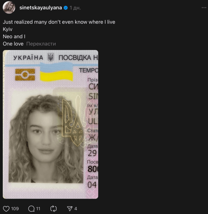 Хотя подробностей о процессе оформления документов Синецкая не раскрыла, она дала понять, что это произошло еще до начала полномасштабного российского вторжения. С началом войны Ульяна публично выразила поддержку украинцам и откровенно осудила агрессивные действия кремлевского режима. Поэтому поклонники исполнительницы предполагают, что в будущем она планирует получить украинский паспорт.