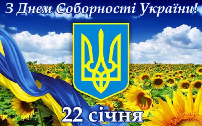 22 січня український народ щороку святкує День Соборності України. Нехай розум, воля і любов до рідного краю згуртовують нас задля здійснення високої мети — процвітання соборної незалежної демократичної могутньої України, надійної запоруки добробуту і щасливого життя її народу.