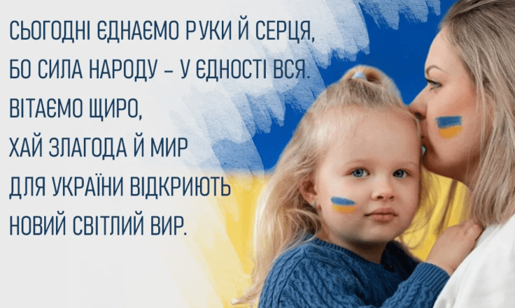 Щиро вітаємо українців з Днем Соборності, з днем ​​єднання українських земель. Усім нескінченного щастя, міцного здоров'я, добробуту. Нехай життя в нашій чудовій країні буде для кожного в достатку, радості, спокої. Нехай завжди над нашими землями світить сонце, і всім нам тут буде світло, тепло та затишно!