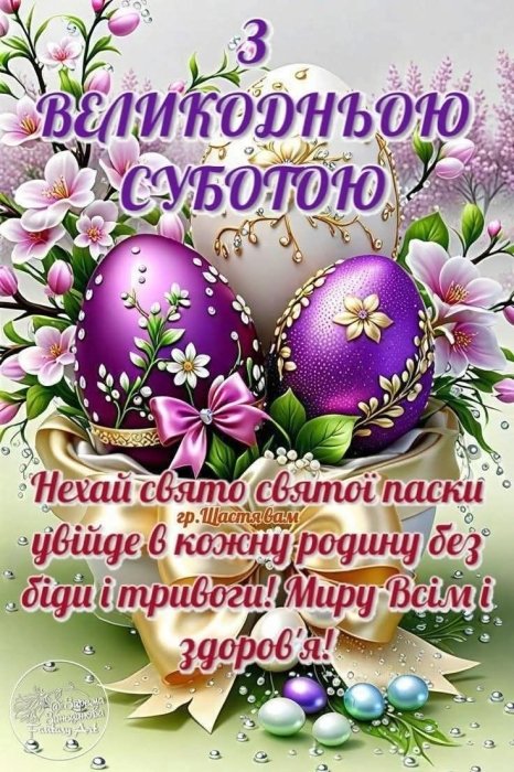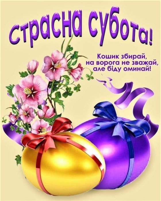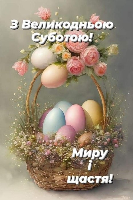 Вітаю вас з великодніми святами! Нехай у цю Велику Суботу ваш дім наповниться миром, теплом і радістю. Хай освячені паски принесуть вам Божий захист та благословення на усі справи. Зі Страсною суботою!