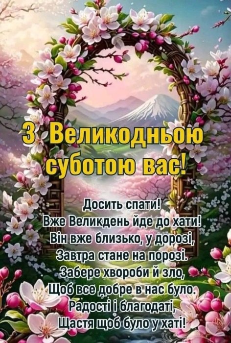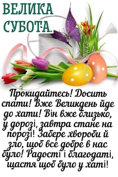 Вітаю з Великою суботою! Нехай у домі буде чистота, в серці — спокій, а в думках — світле очікування великої радості. Бажаю вам Божого благословення та благодаті. Хороші новини вже в дорозі!