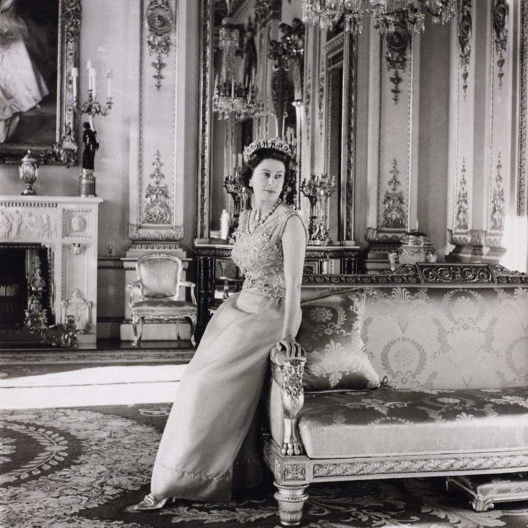 Расшитое бисером и перламутром платье создано дизайнером Hardy Amies. Елизавета ІІ надевала его в 1968 году для официального портрета кисти Сесиль Беатон.