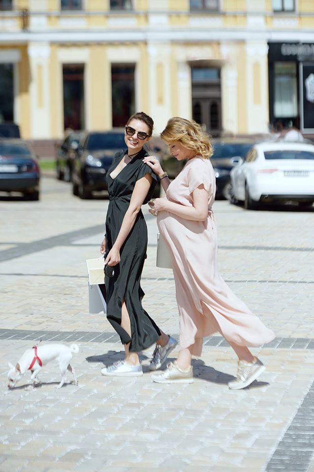 Мягкий нежный образ она дополнила шляпкой. А компанию ей составила подруга, стилист Юлия Косаченко. Надев одну модель платья, девушки продемонстрировали, что OneSize действительно подойдет и беременным, о небеременным модницам.