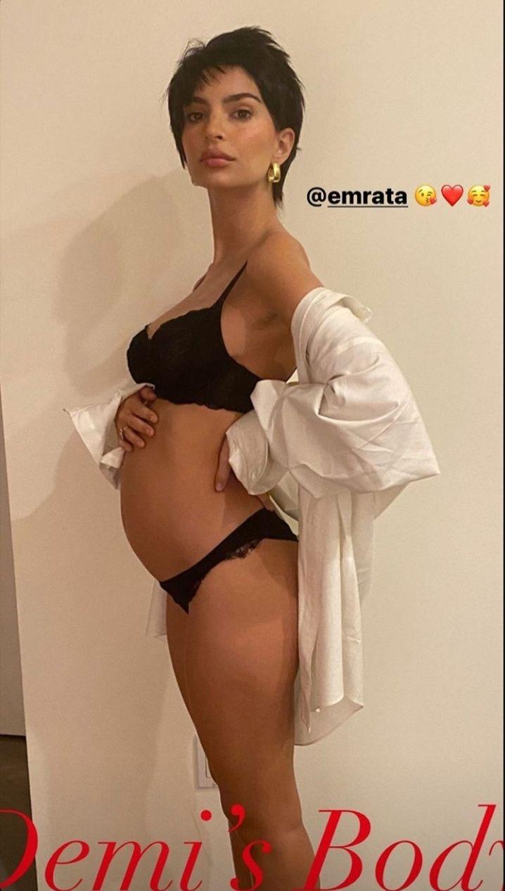 Ратаковски постаралась воспроизвести образ максимально точно – она надела похожее белье, а на плечи накинула шелковую рубашку. Не обошлось и без парика с точно такой же стрижкой, как у Деми Мур. Эмили стоит на фоне белой стены у себя дома, повернувшись полубоком и показав свой внушительных размеров животик. Снимок Эмили запостила у себя в сториз и знаменитая актриса, поддержав молодую коллегу и подругу.