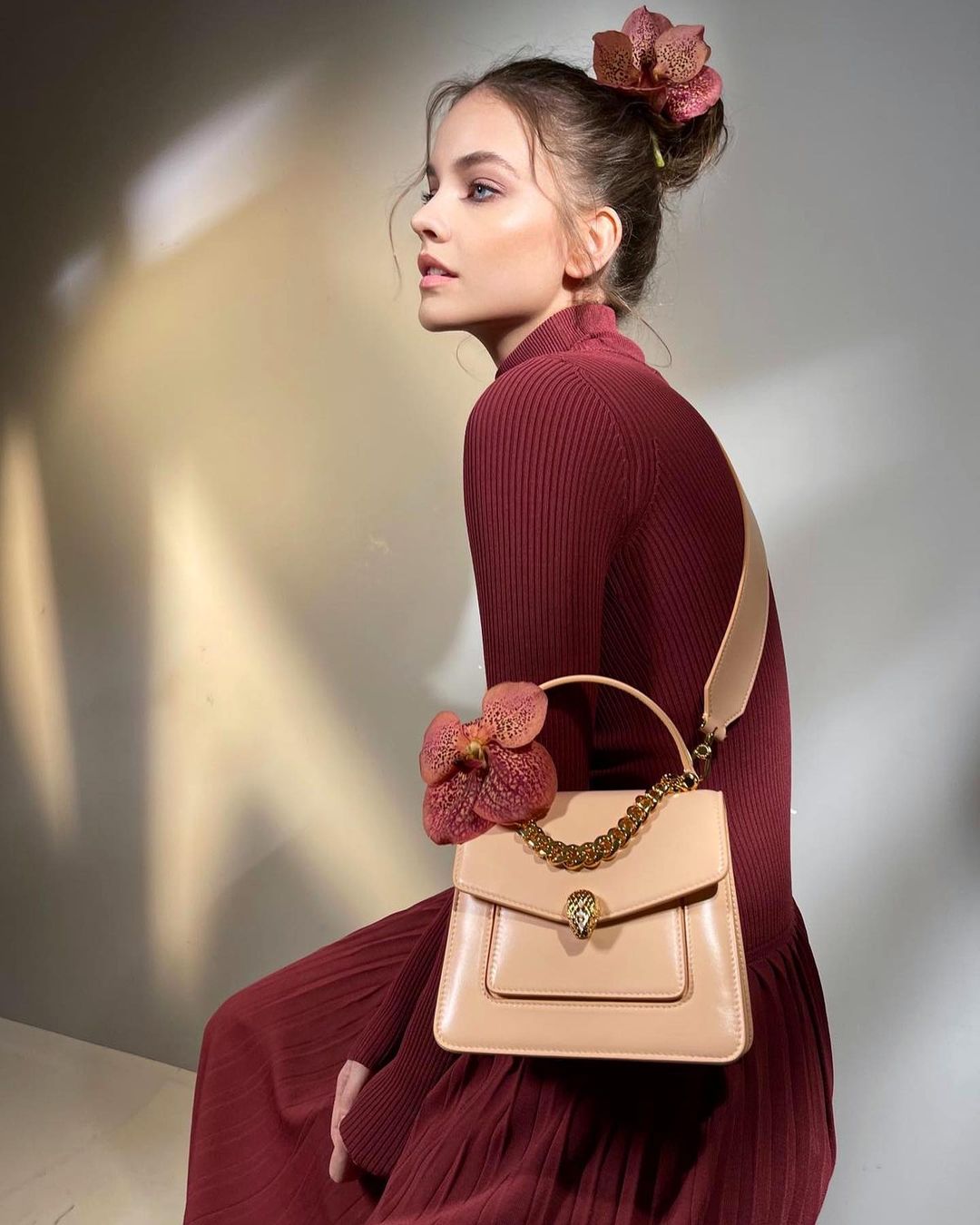 Барбара Палвин представила фанатам свою новую съемку для бренда BVLGARI. Девушка позирует в женственном образе, который составили пышная гофрированная юбка и гольф розово-бордового оттенка, который идеально сочетался с цветами в волосах модели. На этом фоне сумка в бежевом цвете с золотистой цепочкой смотрелась особенно эффектно.