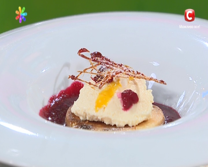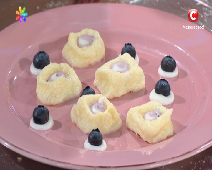 Творожные ньокки «Твин» с ягодами голубики от Екатерины Великой и творожным мороженым с песочным печеньем и ягодным соусом от Евгения Клопотенко.