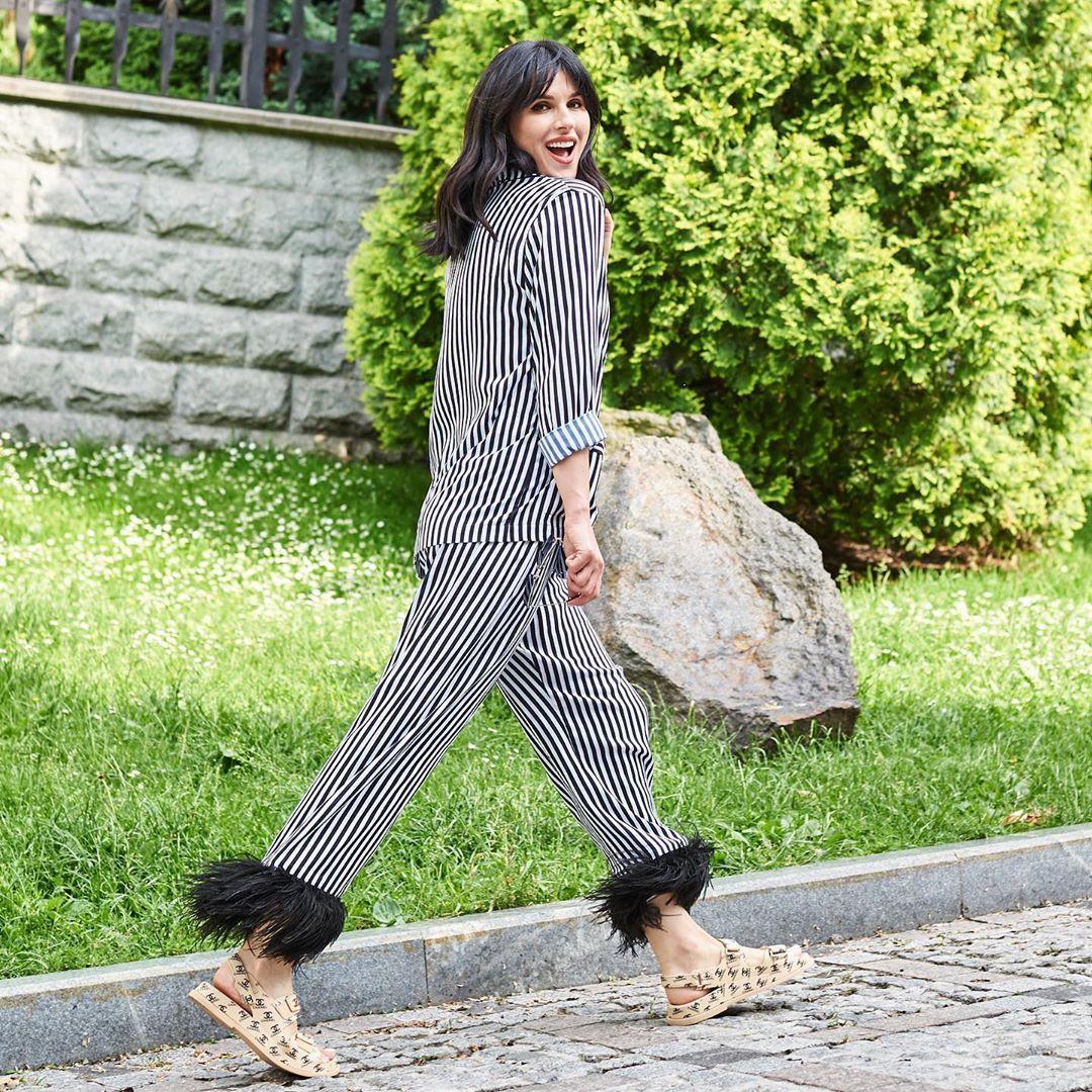 В кадре видно, как Ефросининой идет ее недавнее "обновление" прически — укоротила роскошные длинные локоны и остригла челку. Знаменитость выбрала для подчеркивания природной красоты черных волос интересный стильный костюм "аля пижама". Причем штаны украшает возле стоп оригинальная пряжа, словно черные пушистые "копытца" зебры. А завершает образ стильные светлые босоножки.