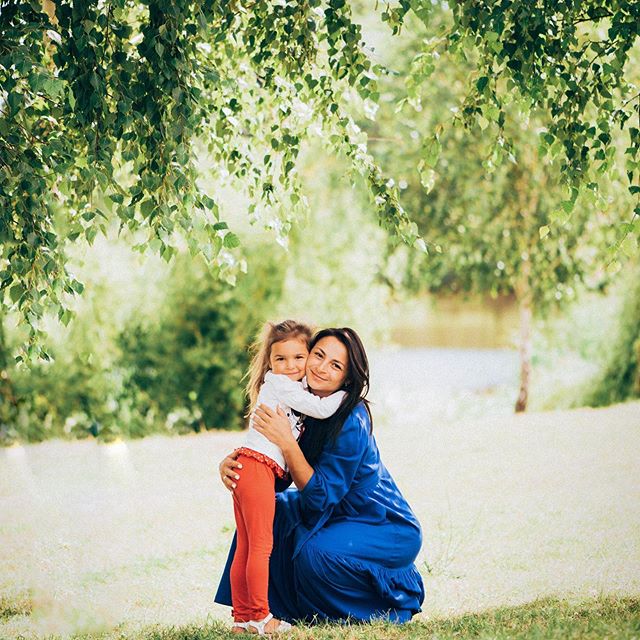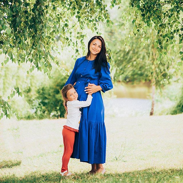 Для семейного девичьего фотосета Гвоздева надела длинное женственное синее платье с оборкой на подоле и поясом, которое подчеркнуло ее беременный животик, а девочка — яркий костюм. Лера нежно обняла маму и крепко прижалась к ней, зажмурив глаза.