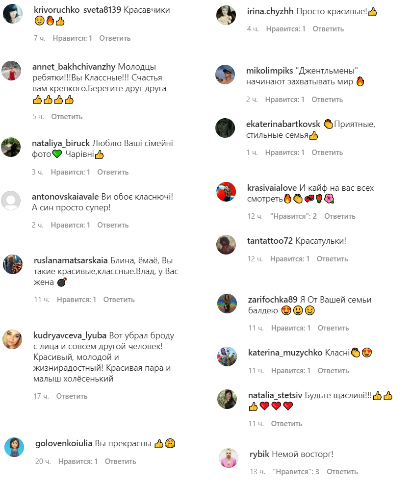 Красавчики! Молодцы ребятки!!! Вы классные!!! Счастья вам крепкого. Берегите друг друга! Просто красивые! Люблю ваши семейные фото! Волшебные Вы оба класнючие! А сын просто супер! "Джентльмены" начинают захватывать мир Приятные, стильная семья И кайф на вас всех смотреть! Красатульки! Блин!… Вы такие красивые, классные. Влад, у вас жена бомба! Я от вашей семьи балдею! Будьте счастливы! Вот убрал броду с лица и совсем другой человек! Красивый, молодой и жизнерадостный! Красивая пара и малыш хорошенький! Немой восторг!