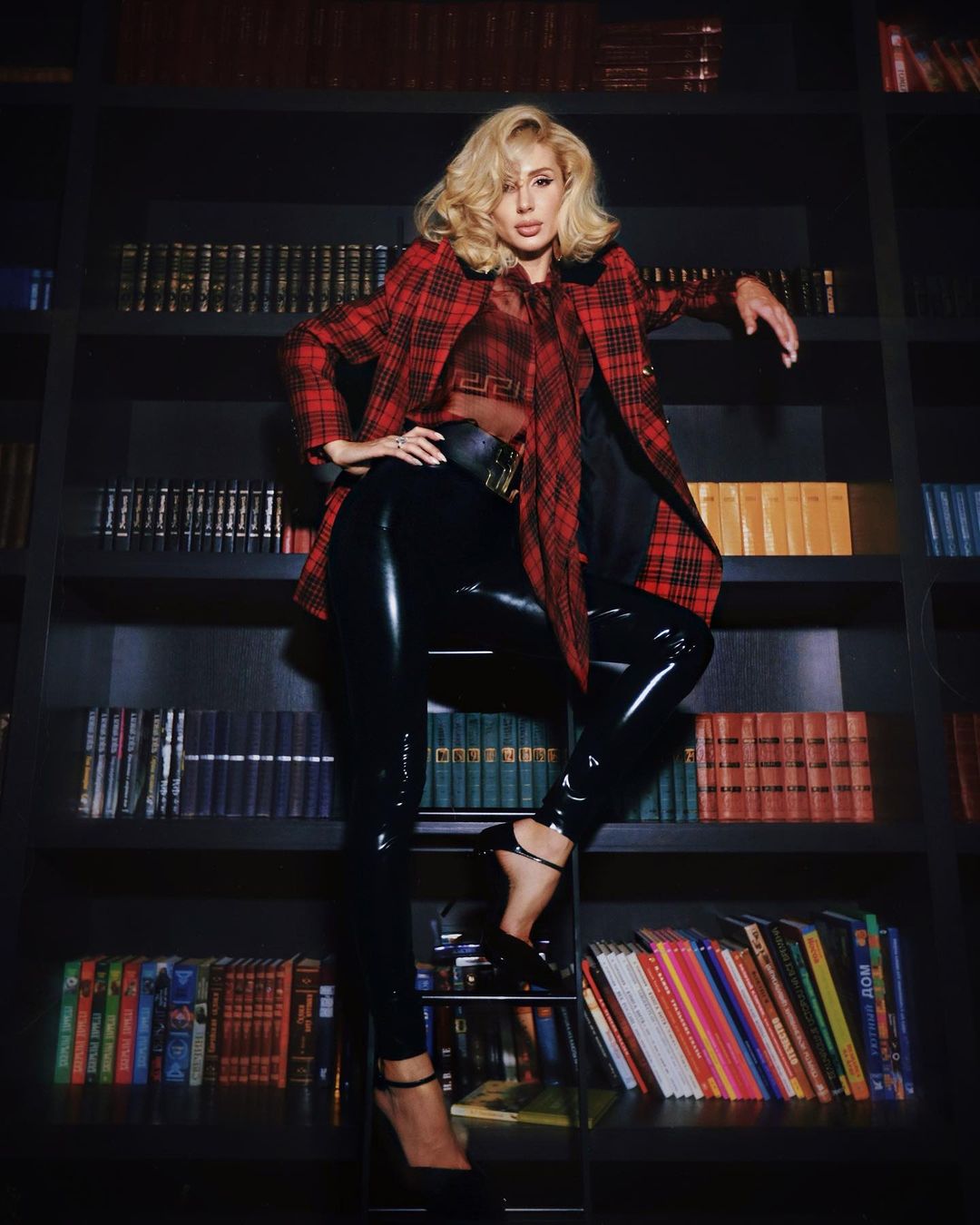 Обтягивающие черные кожаные брюки, высокий каблук, широкий ремень, блуза с соблазнительными завязками-"галстуком" и пиджак в красную клетку, певица позирует на лестнице рядом с книжной полкой.