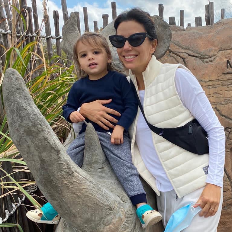 На новом фото Ева позирует с сыном во время прогулки. Сама актриса одета в спортивные брюки, светло-сиреневый лонгслив, а также белый стеганый жилет. Из аксессуаров она прихватила солнцезащитные очки cat eye, а также защитную маску. Санти заботливая мама одела в серые удобные брюки, синий джемпер и голубые кроссовки. Пост звезда посвятила здоровью детей.