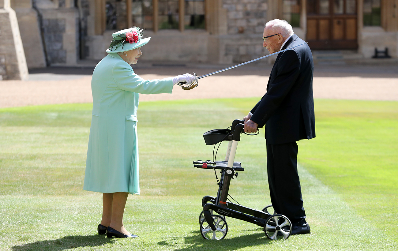 Елизавета II посвящает в рыцари ветерана Тома Мура, собравшего миллионы в пользу медработников (фото: Getty Images)