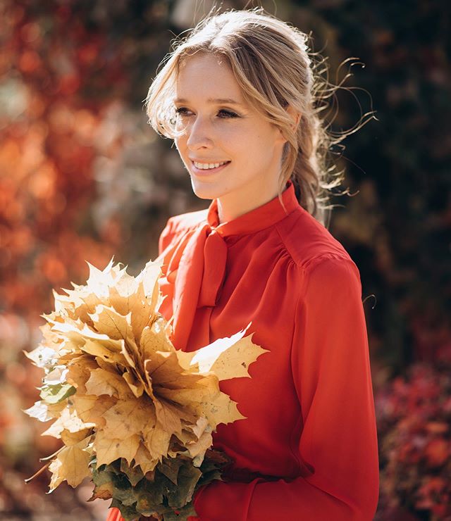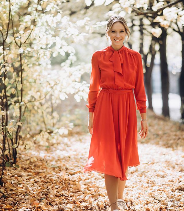 Ведущая опубликовала в Instagram осенние кадры в летящем шифоном платье-миди апельсинового приглушенного оттенка с бантом на шее. Она собрала сзади волосы, выпустив пару завитых локонов на лицо. Ведущая держит в руках букет из пожелтевших листьев.