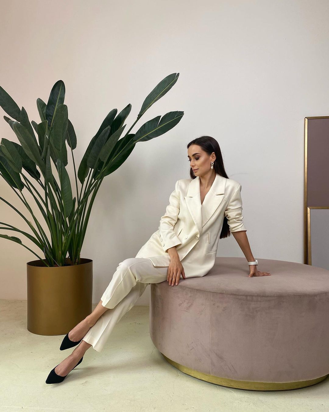 На этот раз актриса в своем Instagram не стала откровенничать о личном, а просто продемонстрировала шикарную фигуру. Ксения запостила снимок, на котором она сидит на круглом пуфе возле красивого цветка в трендовом белом брючном костюме. Образ дополнили стильные черные туфли с острым носком и аксессуары: белые серьги и наручные часы.