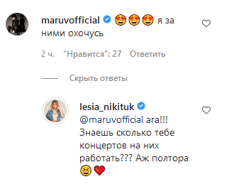 "Я за ними охочусь", — оставила подпись под фото обновы подруга ведущей, MARUV. "Ага! Знаешь сколько тебе концертов на них работать? Аж полтора", – с юмором ответила ей Леся.
