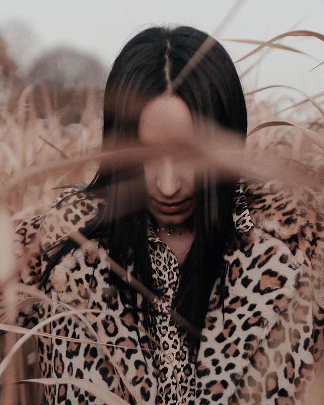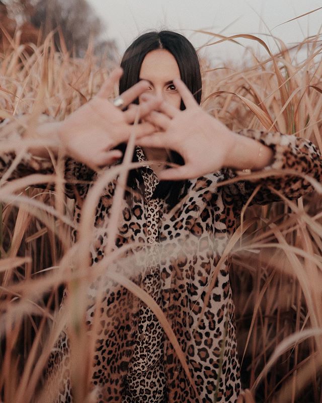 Так, артистка нарядилась в платье с леопардовым рисунком, а наверх надела эко-шубку с аналогичным, только более крупным принтом. Она расположилась среди пожелтевшей высокой травы в поле и устроила атмосферный фотосет.