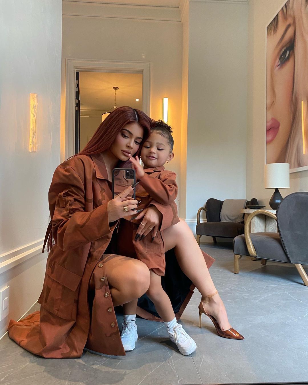 Кайли Дженнер обожает подбирать одинаковые образы со своей 2-летней дочерью Сторми. Новый из них появился на странице модели и бизнесвумен несколько часов назад. 23-летняя звезда сети примерила длинный плащ кирпично-коричневого оттенка с накладными карманами в стиле сафари. Вместе с ним Кайли обула утонченные туфли на шпильке. Девочка красуется в костюме такого же оттенка с деталями, которые повторяют мамин образ. Правда, обула она удобные белоснежные кеды.