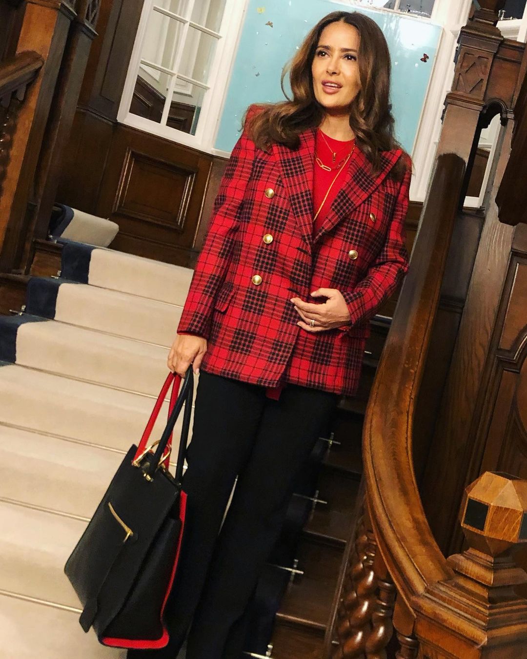Сальма Хайек опубликовала новое фото в стильном наряде, который выгодно подчеркнул ее стройную фигуру. Звезда надела черные классические брюки, а также красно-черный пиджак, под который подобрала красный топ. В руках она держала объемную сумку в тон всему образу. Для выхода 54-летняя знаменитость сделала укладку, подкрутив волосы, а в макияже предпочла легкие натуральные оттенки, которые отлично оттенили сияние смуглой кожи вечно молодой звезды.