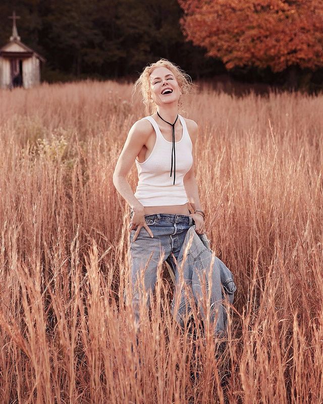 Николь Кидман показала новое фото, сделанное для Vogue Australia. На нем актриса предстала в достаточно откровенном образе: голубых классических джинсах и топе, которые оголили живот 53-летней голливудской звезды, плечи и руки. Образ знаменитости дополнили стильный чокер-шнурок, а также браслеты. В руках она держит джинсовый пиджак. Волосы ей собрали в небрежный пучок — это сделало лук молодежным и стильным. Она весело смеется, закинув голову, и выглядит свежей и сияющей.