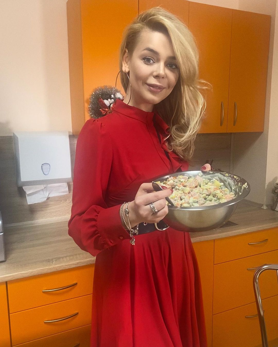 А вот салат оливье на Новый год — точно входит в список обязательных вещей Алины, судя по ее снимкам. Певица запостила в своем микроблоге фото, на которых она стоит в изысканном стильном красном платье с укладкой и в огромных серьгах-кольцах. В руках Алина держит… большую миску салата оливье.