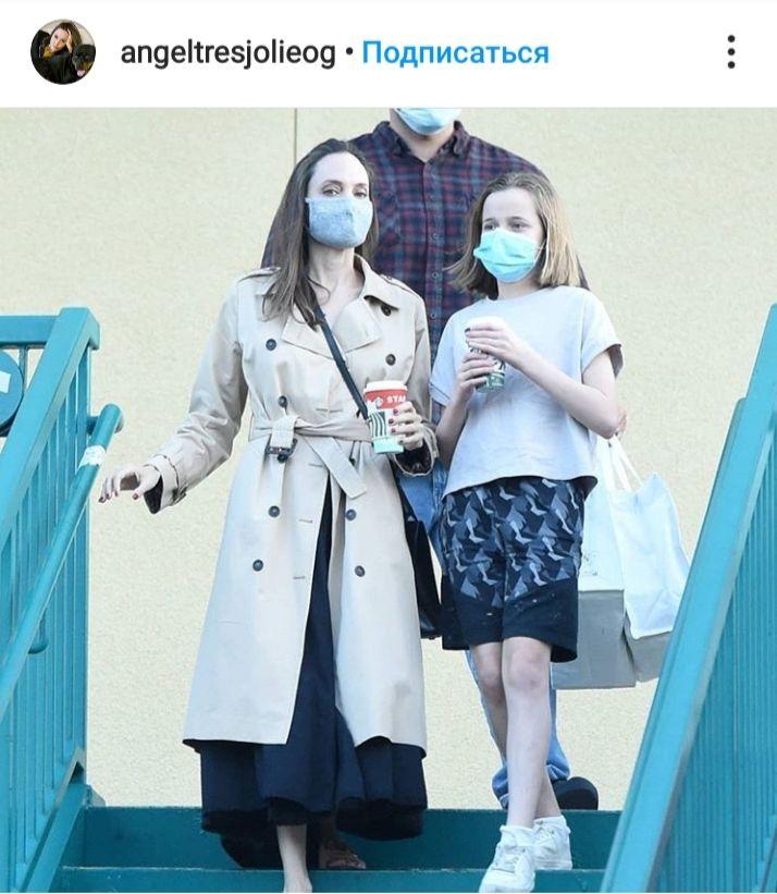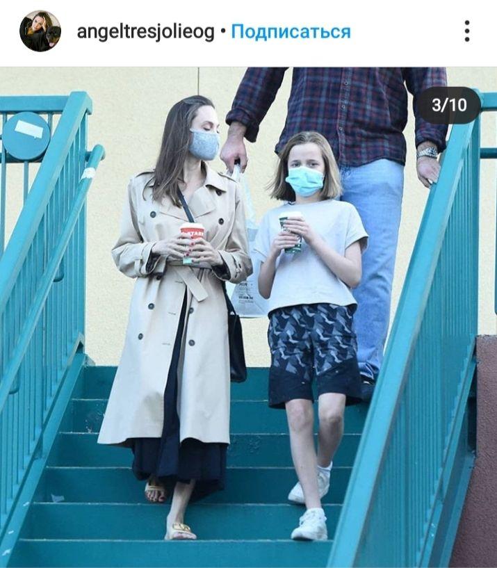 Вместе с Джоли они отправились в кофейню, прихватив с собой напитки, чтобы прогуляться. Мама и дочь что-то обсуждали, обнимались и выглядели, словно подруги. А вот фанаты Анджелины успели обсудить не только стильный образ мамы, но и слегка неудачный – дочки. Они считают, что Вивьен пора подобрать себе что-то более стильное, чем подростковые бесформенные наряды.