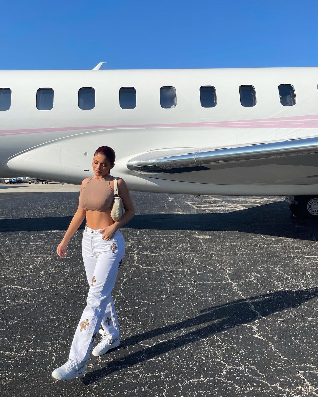 Кайли Дженнер меняет свои роскошные наряды со скоростью света. В этот раз девушка решила сделать ставку на практичный образ, но не без горячих деталей. В полет, куда она отправилась накануне Рождества, самая юная миллионерша в мире надела белые широкие брюки с высокой посадкой, украшенные аппликацией в виде золотистых крестов. Дополнили их белоснежные кеды, маленькая "меховая" сумочка. А главной деталью аутфита стал топ телесного оттенка, который отлично подчеркнул аппетитные формы и железный пресс красавицы.