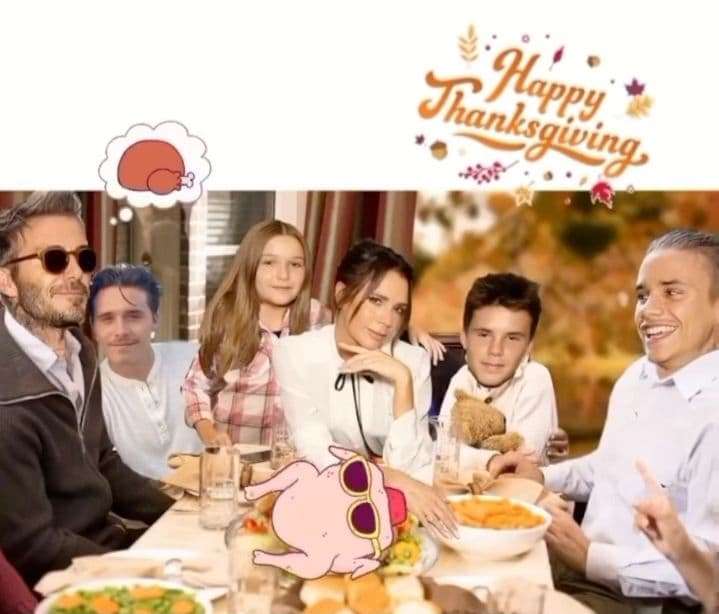 Виктория Бекхэм показала новый семейный снимок, на котором присутствует вся ее семья. На коллаже позируют Дэвид, сама Виктория, Бруклин, Ромео, Харпер Севен и Круз. Все они сидят за столом, заставленным блюдами, есть здесь и символ Дня благодарения — идейка. Именно этому празднику посвятила новый пост британская икона стиля.