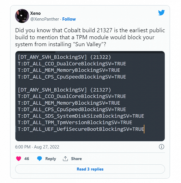 Пользователь Twitter и инсайдер под ником Xeno рассказал, что в сборке системы под Windows 10 номером 21327 обнаружил упоминание модуля TPM. Таким образом, эти требования могут появиться ещё в актуальной версии ОС.