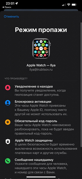 - Перевести устройство в «Режим пропажи», но не указывать номер для связи или сообщение, нажать «Далее».
